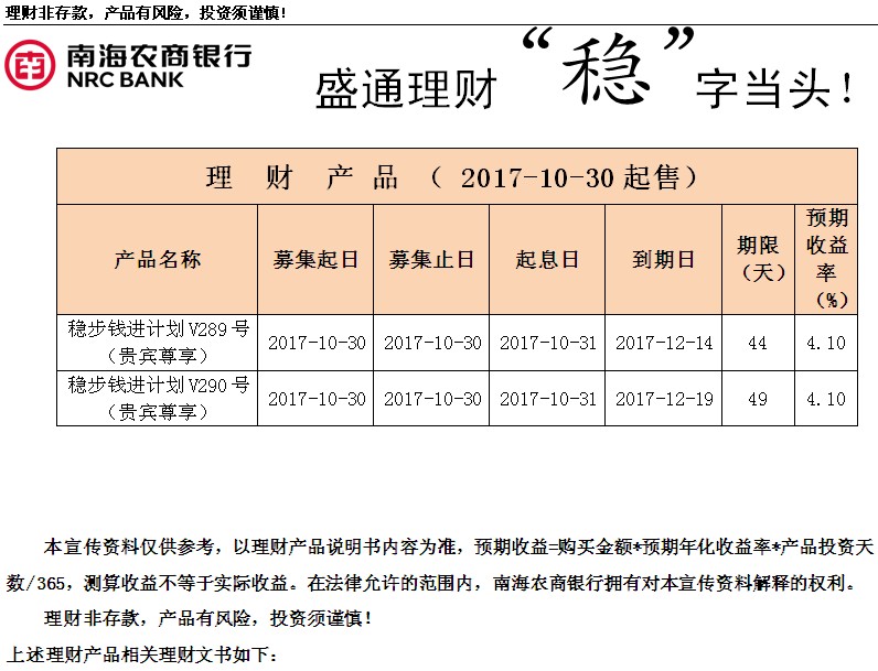 【发行公告】封闭式理财产品发行公告(10.30起售)