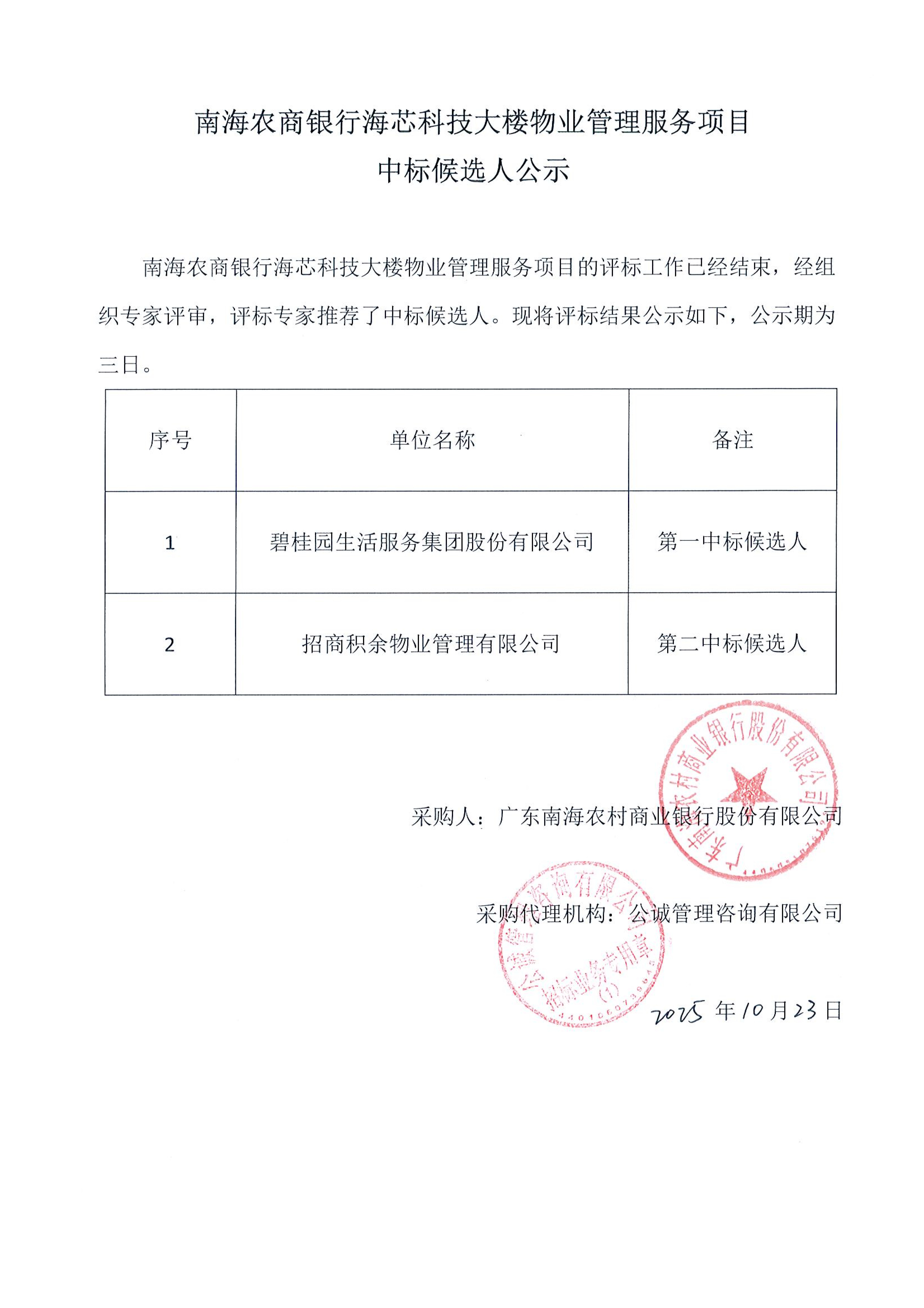南海农商银行海芯科技大楼物业管理服务项目中标候选人公示