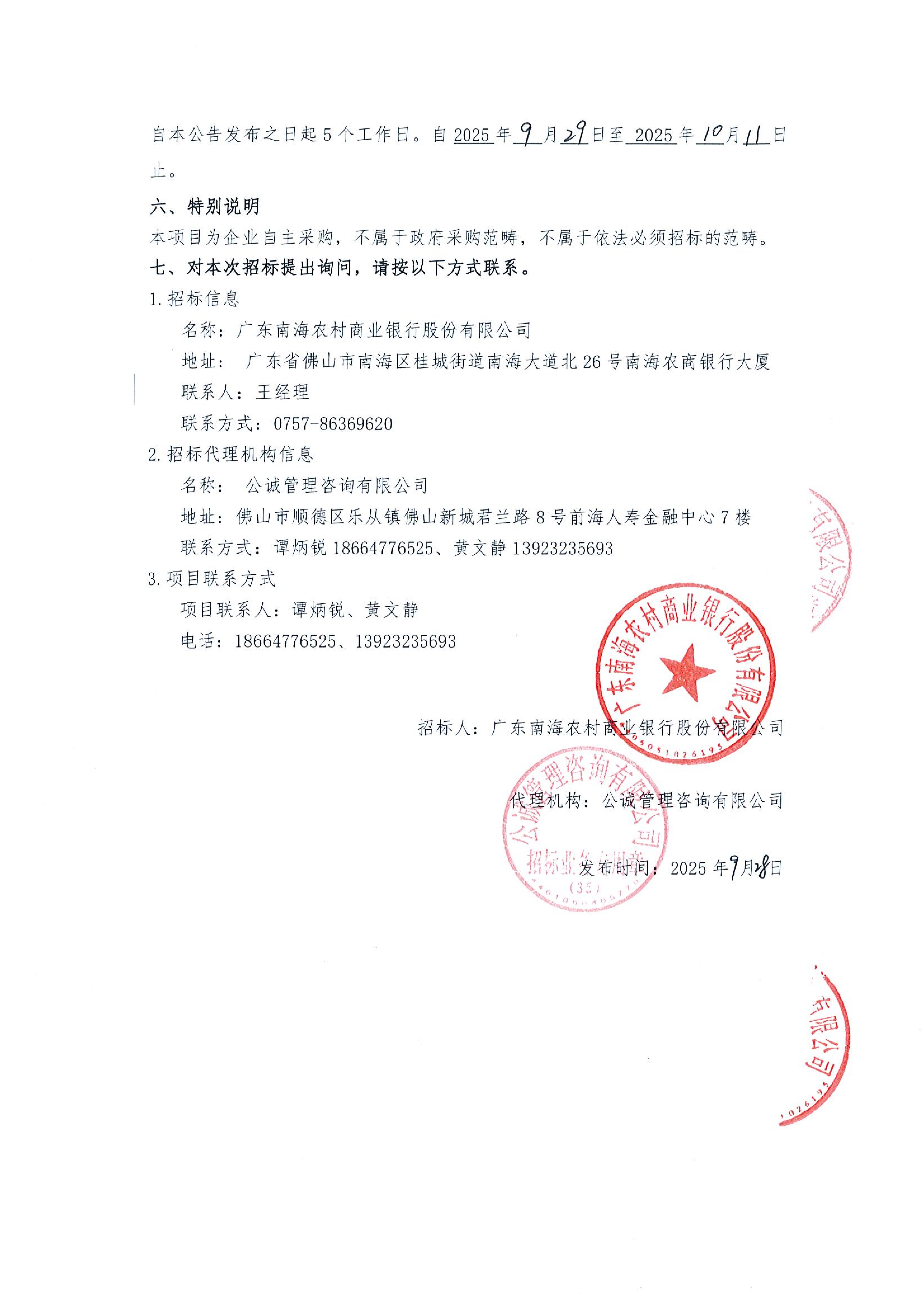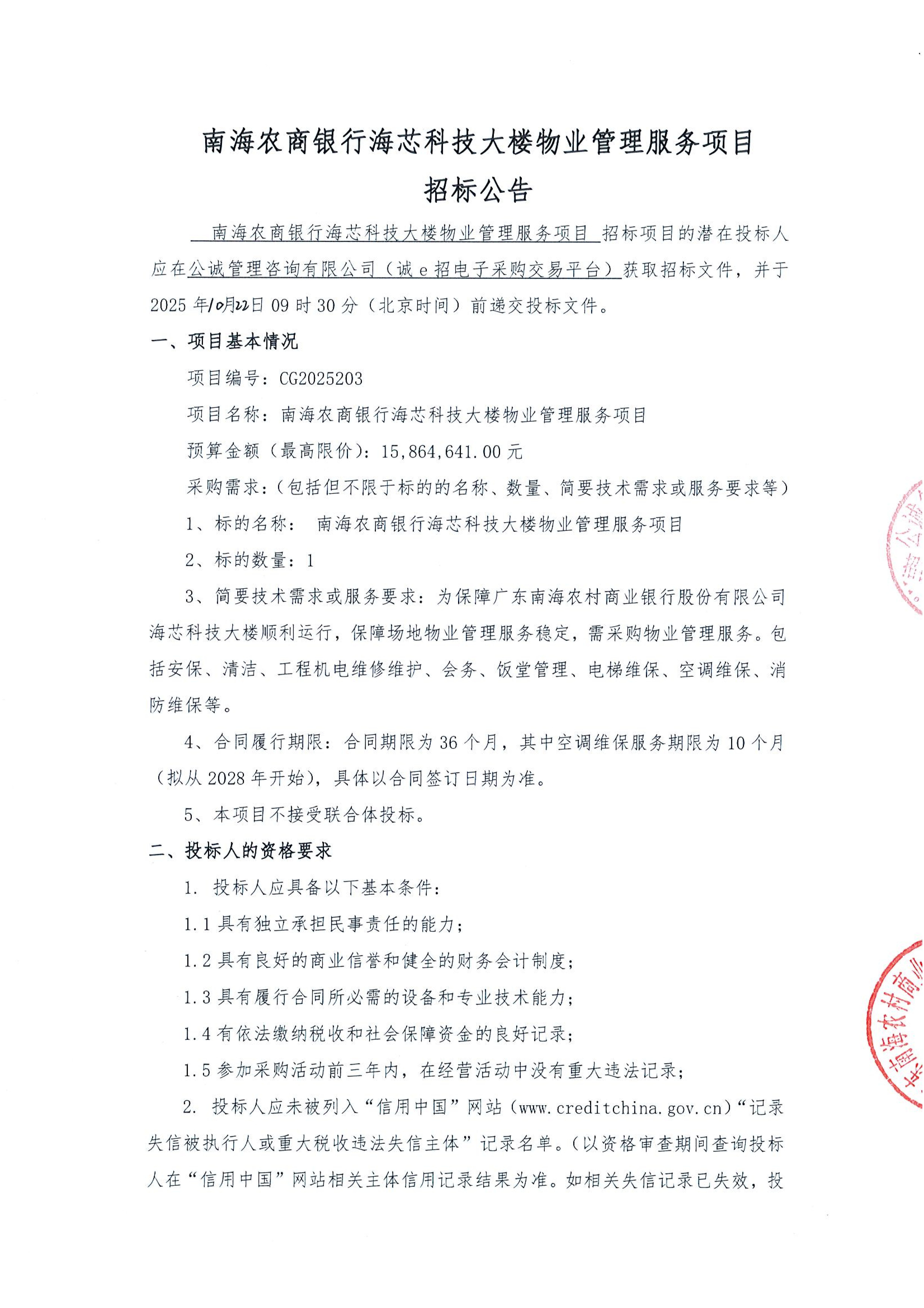 南海农商银行海芯科技大楼物业管理服务项目招标公告
